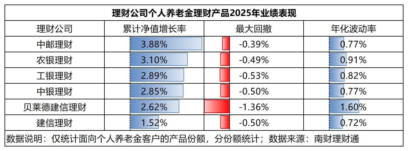 分机构来看,中邮答允个东说念主待业金居品2025年平均收益率最高,为3.88%,同期居品最大回撤最低,仅-0.39%,居品质价比较高。农银答允次之,平均收益率为3.10%。比拟之下,建信答允个东说念主待业金居品证据靠后,2025年累计净值增长率仅为1.52%。值得严防的是,结伴答允公司贝莱德建信答允的个东说念主待业金居品风险偏好相对更高,居品最大回撤和年化波动率均向上1%。不外,以上仅仅2025年的收益情况,个东说念主待业金居品锁依期限较长,投资者照旧更应该讲理居品的永久事迹和投资价值。