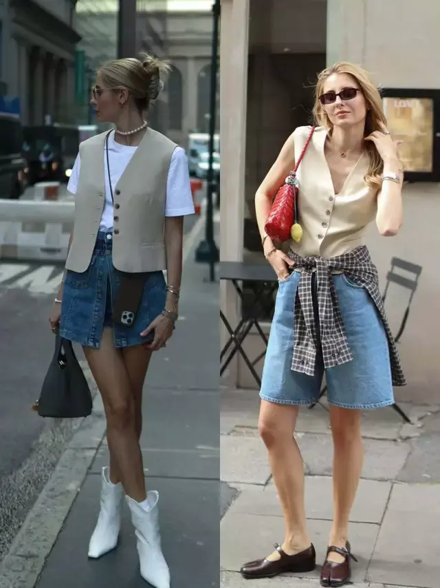 或是换成一件卡其色的马甲,配上蓝色的牛仔短裤,脚踩棕色浅口单鞋,透露元气,满满的芳华活力,这两种穿法随心切换我方心爱的魄力与时局,百搭又出彩。