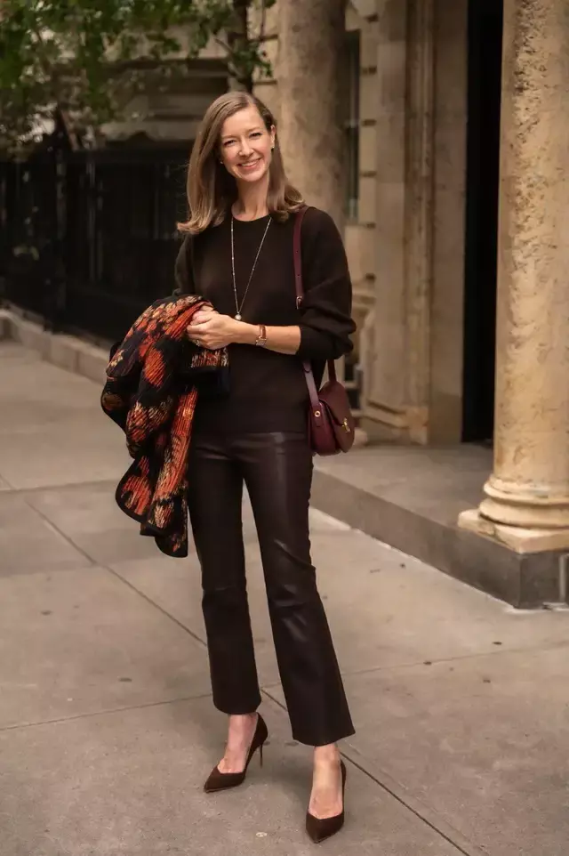 我们还不错换别的搭配念念路,用一件深棕毛衣搭配同色系的皮裤,脚踩棕色浅口高跟单鞋,肩膀上挎的一款棕红色的包包,复旧硬朗,刚柔并济的搭配组合,尽显优雅与魄力。