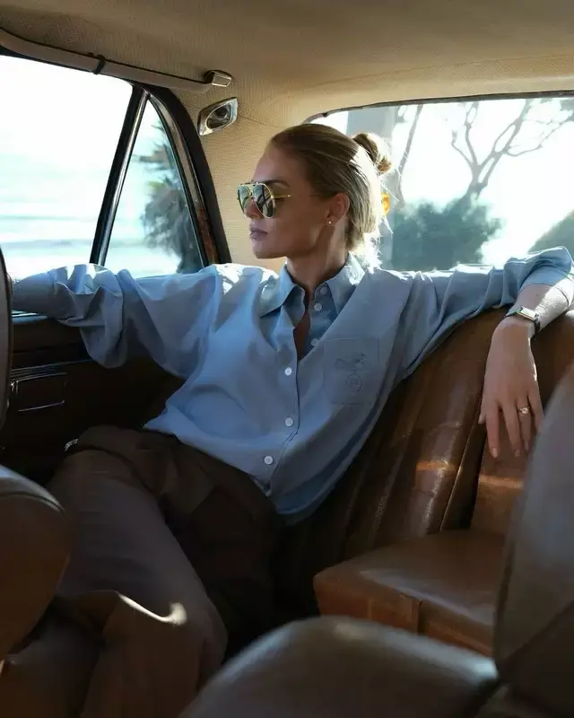 或是选拔一件蓝色的衬衫搭配上棕色的西装裤,色调质朴又精良。这样的衣服组合利落又大气。