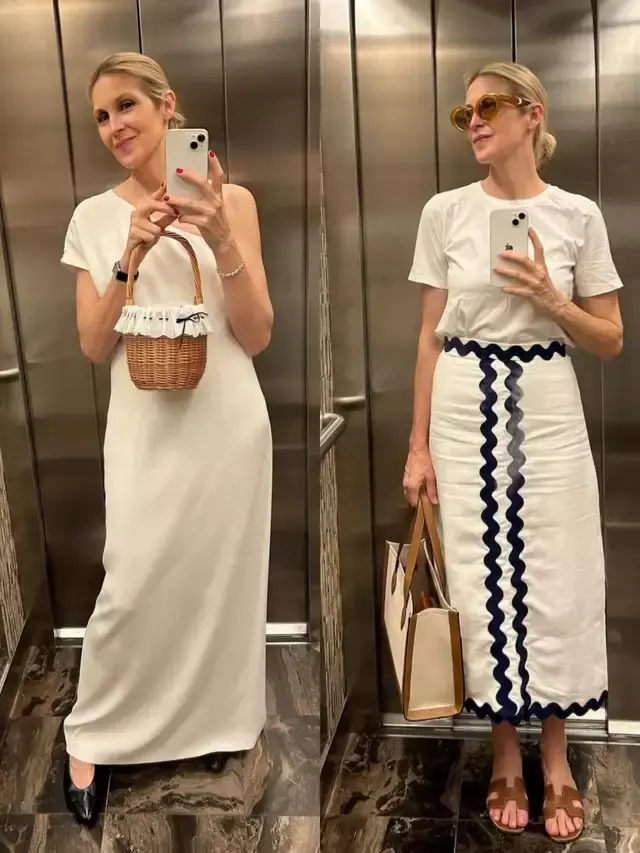 举例上头右边这一套穿搭,用白 T 恤加上拼接色直筒半身裙,既褶皱无垂坠感,面料仍是硬触感不柔嫩,就算衣服时势瞎想很勤俭,但也很难显昂贵。