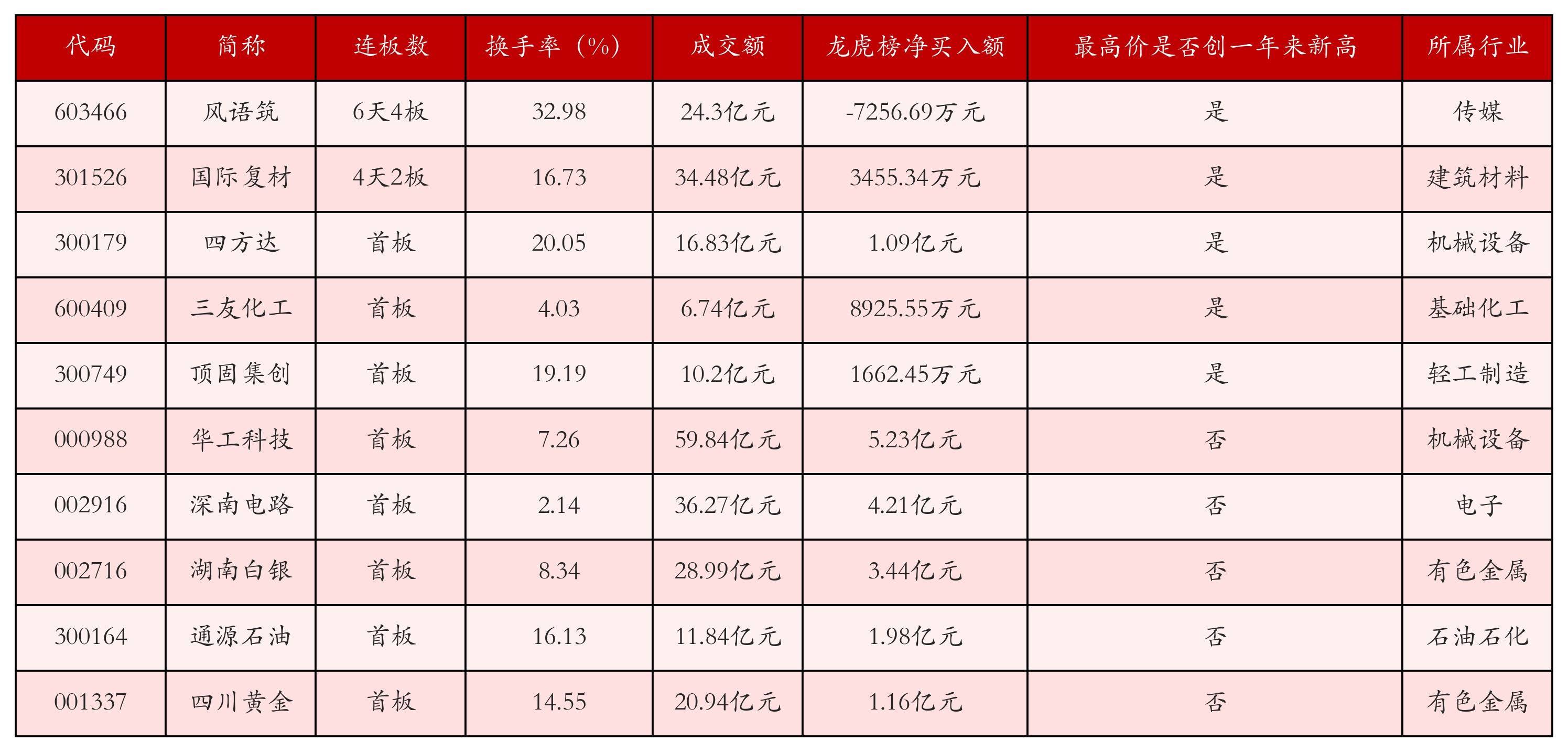 完毕2月24日收盘,上证综指上升0.87%,收于4117.41点,深证成指上升1.36%,收于14291.57点,创业板指上升0.99%,收于3308.26点。当天沪深两市A股总共110只涨停,概述刻下连板数以及当日龙虎榜数据,其中较为强势的前三只个股区分为:风语筑(603466)、国外复材(301526)与四方达(300179)。当天强势个股前10位具体数据见下表: