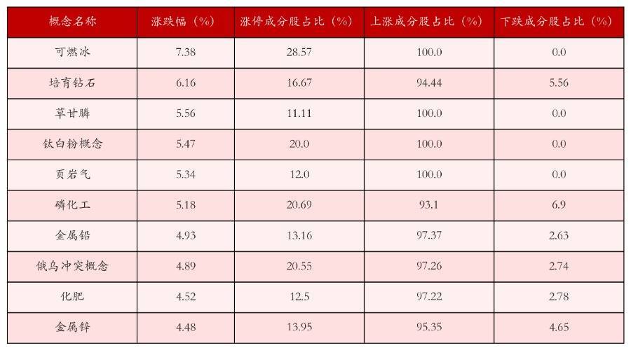 字据A股成见涨跌幅与所对应的股票池概述分析,涨幅靠前的三个成见板块区分为:可燃冰、栽植钻石与草甘膦。排行前10位的成见板块关扫数据见下表: